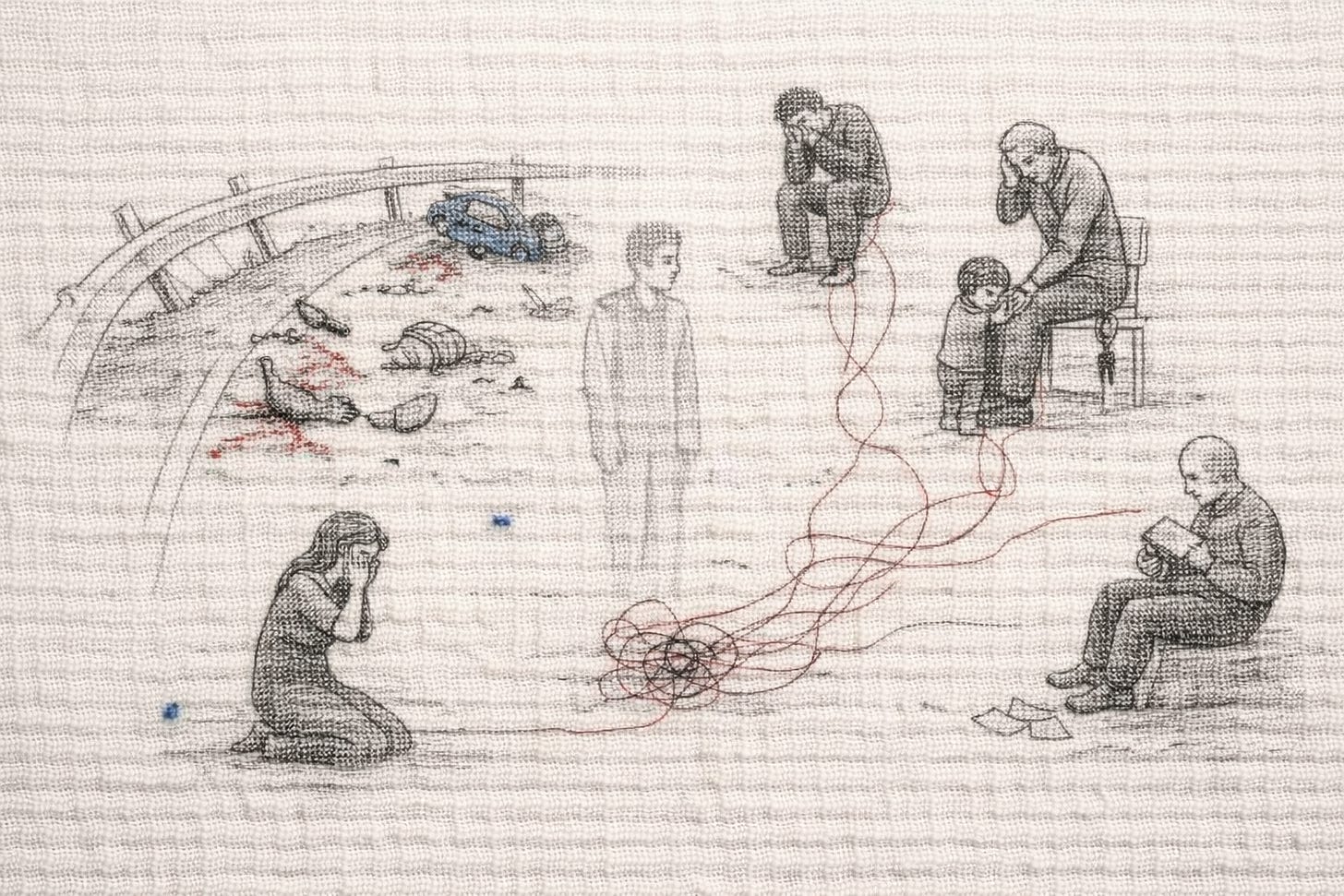 En el margen lateral de una carretera, un refrigerador, vuelto hacia el vacío. A unos metros, un camión de Kroger, “fresh food for everyone”, sobre la grava. Las margaritas brotan del concreto, sus tallos tiemblan con olor a diésel. Los vidrios rotos brillan como peces, el aire sabe a fruta fermentada. [...]