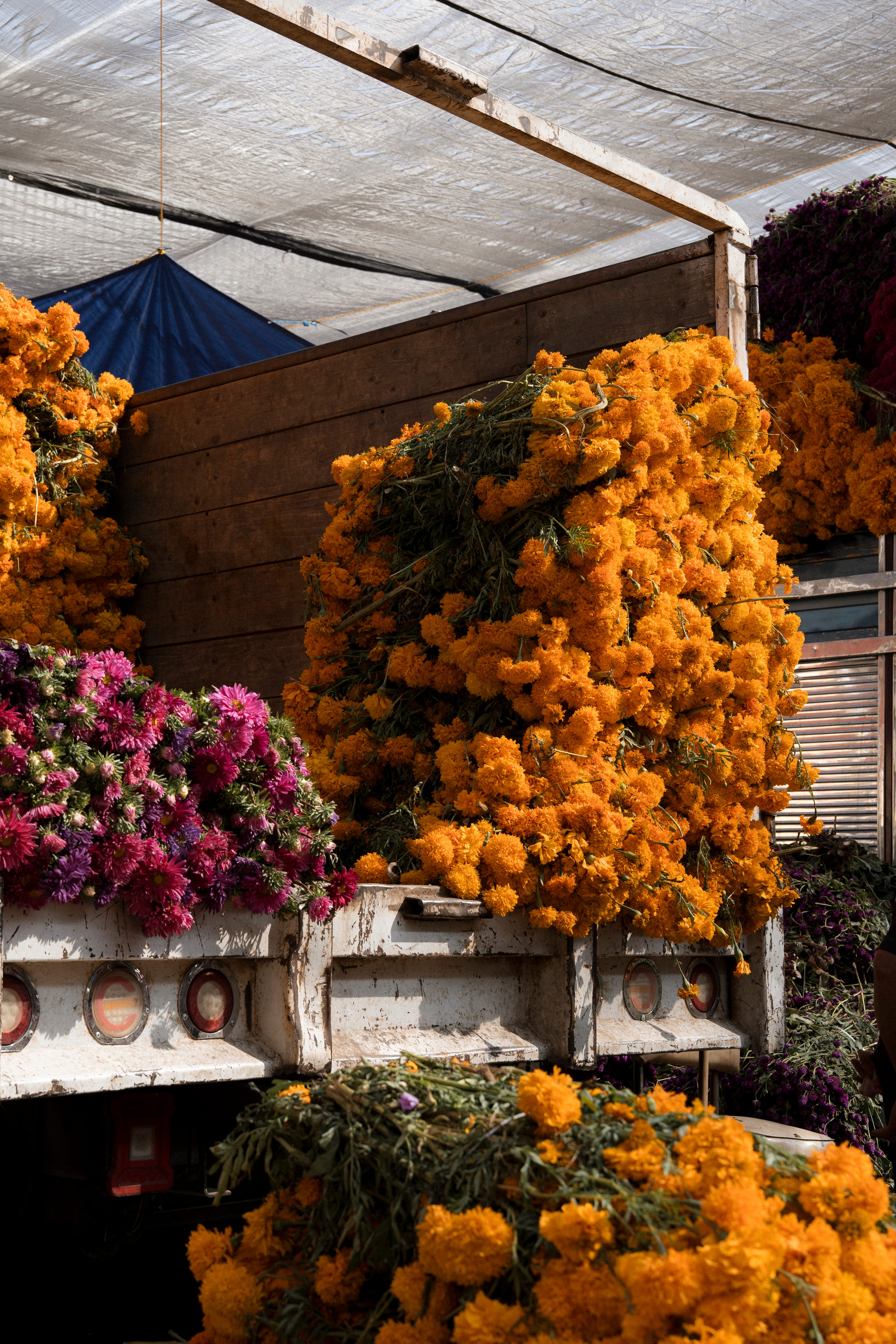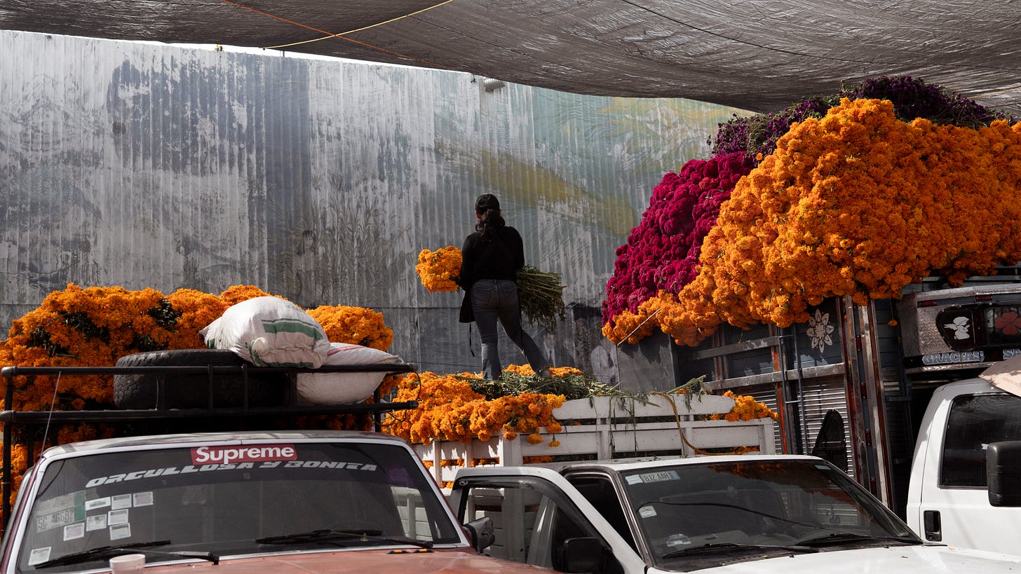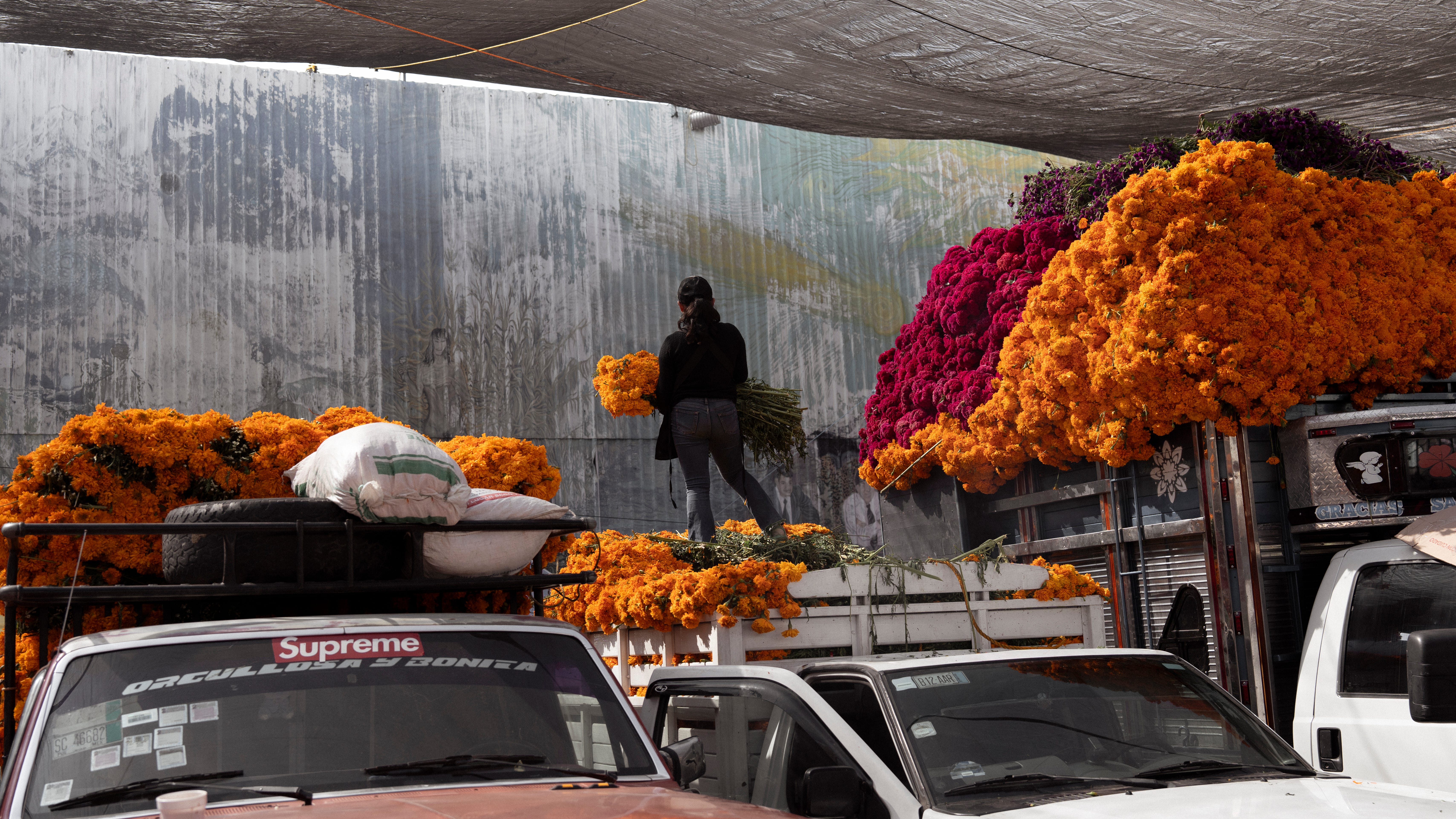 Son las seis de la mañana y decenas de camiones que viajaron desde Atlixco empiezan a llegar a Jamaica. Repletos de flores, basta verlos para saber que van al límite —parece que un solo cempasúchil más bastaría para que se desbordaran—.
