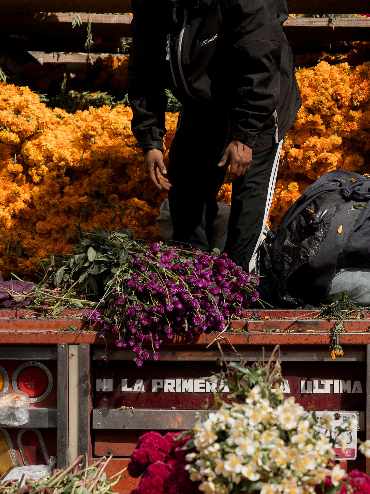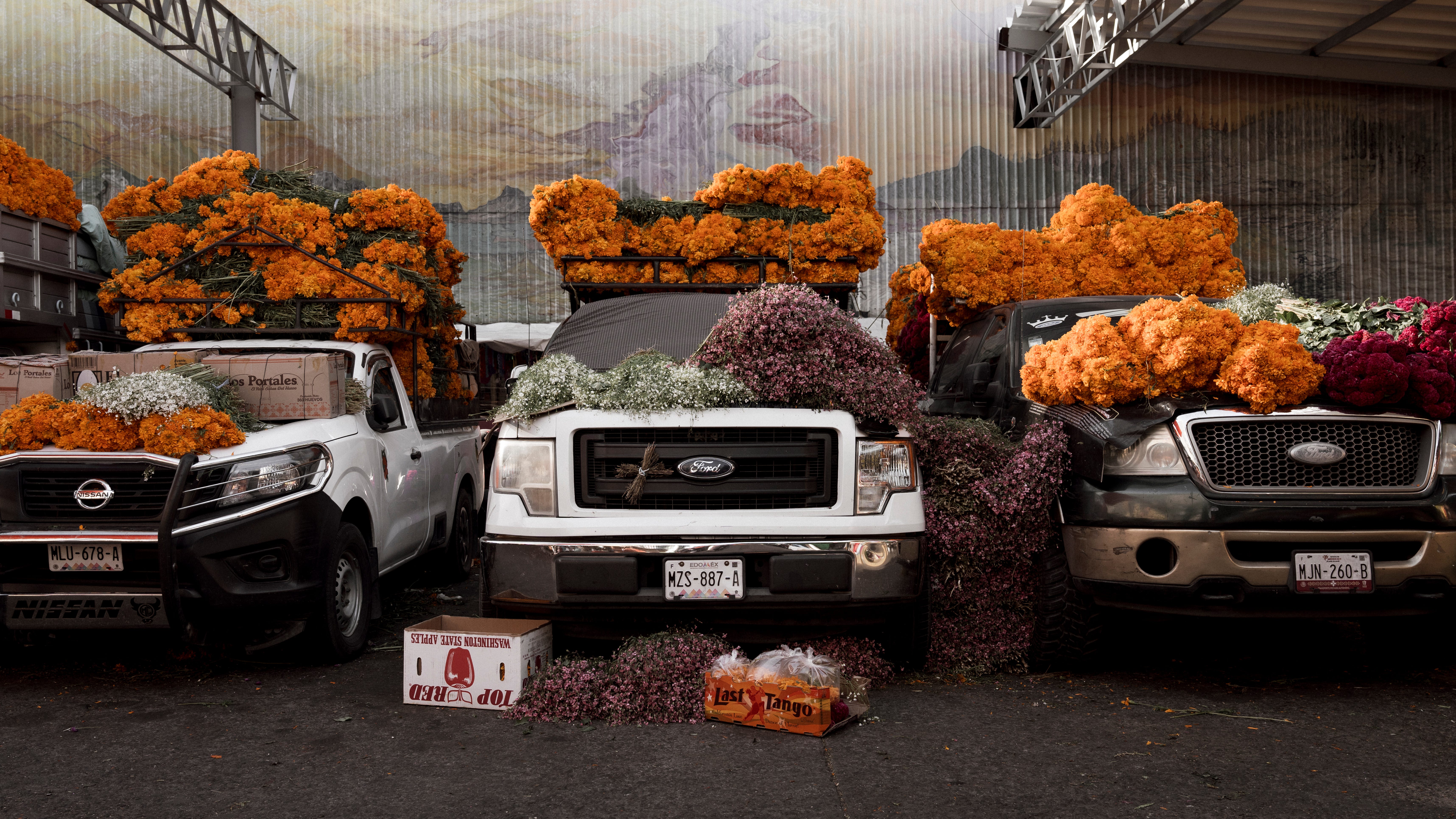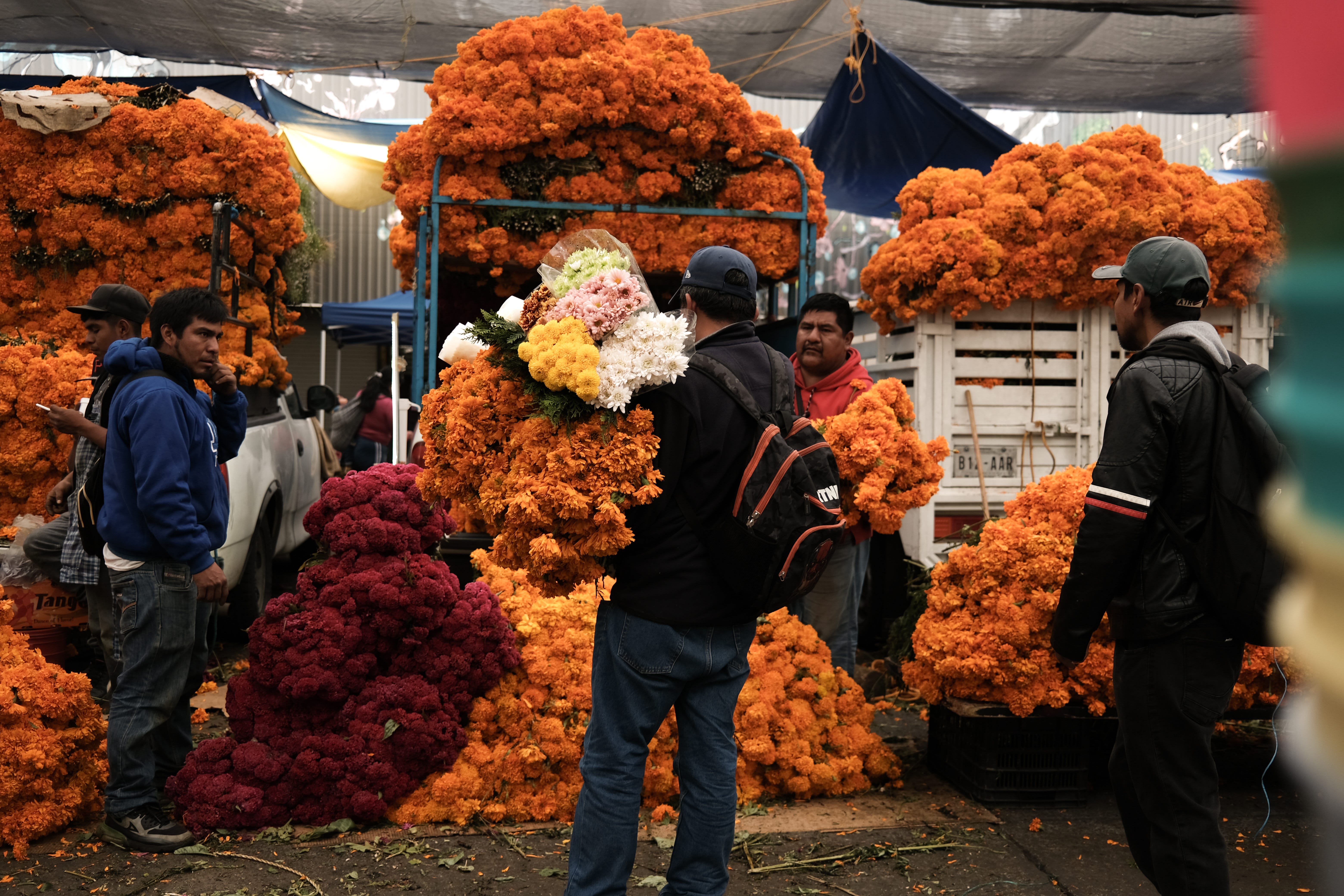 Son las seis de la mañana y decenas de camiones que viajaron desde Atlixco empiezan a llegar a Jamaica. Repletos de flores, basta verlos para saber que van al límite —parece que un solo cempasúchil más bastaría para que se desbordaran—.