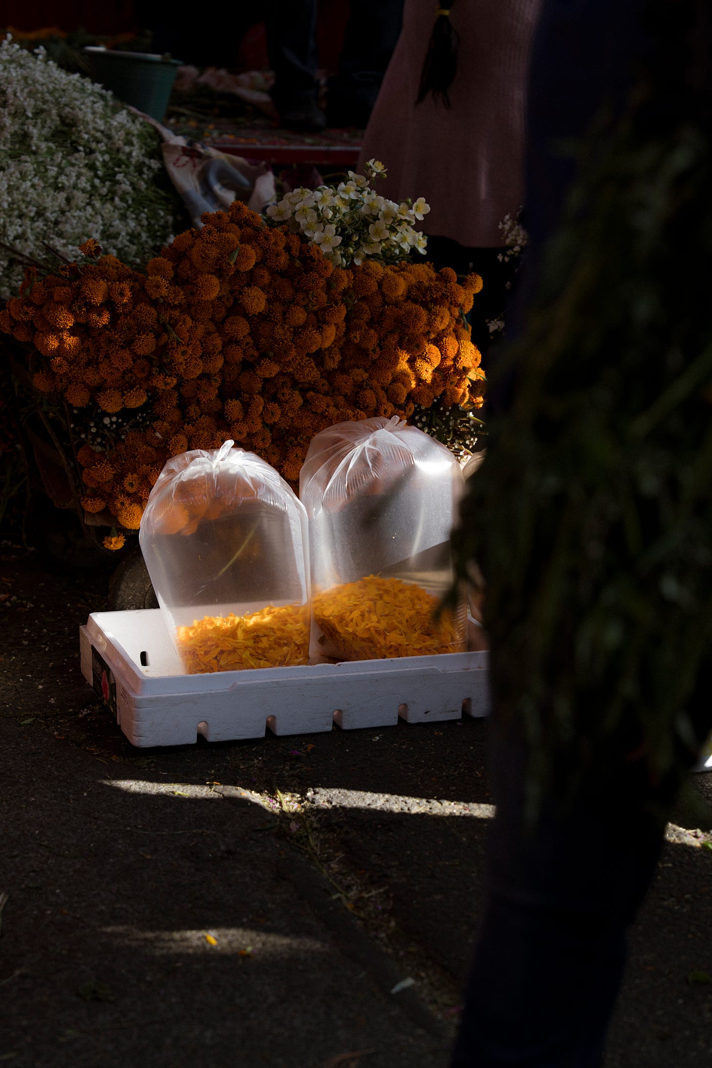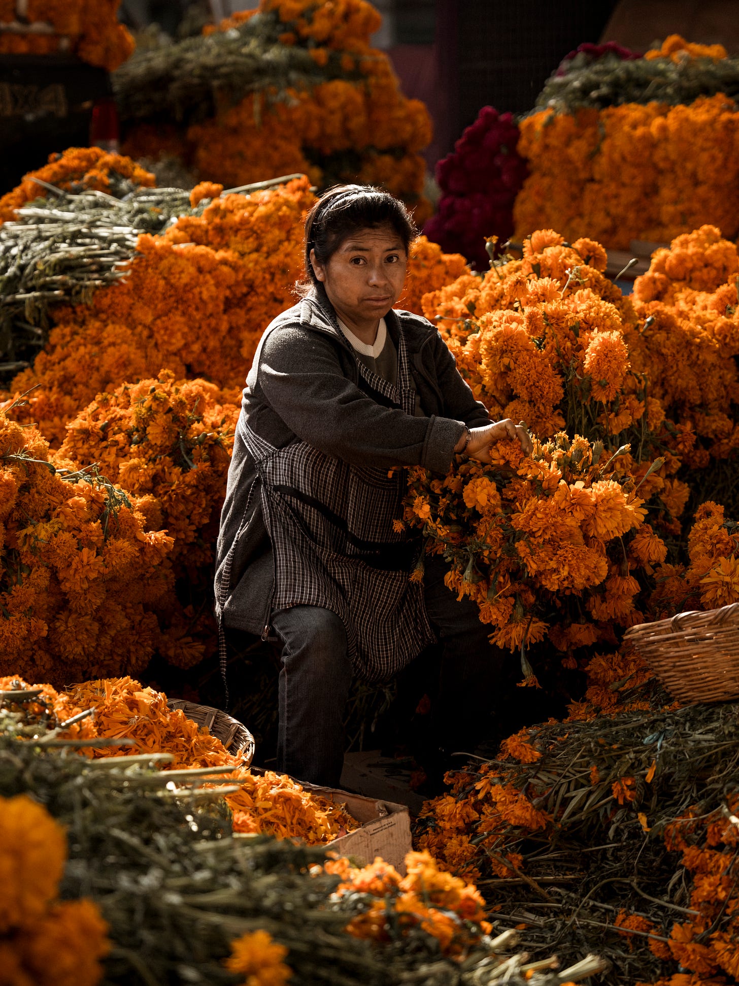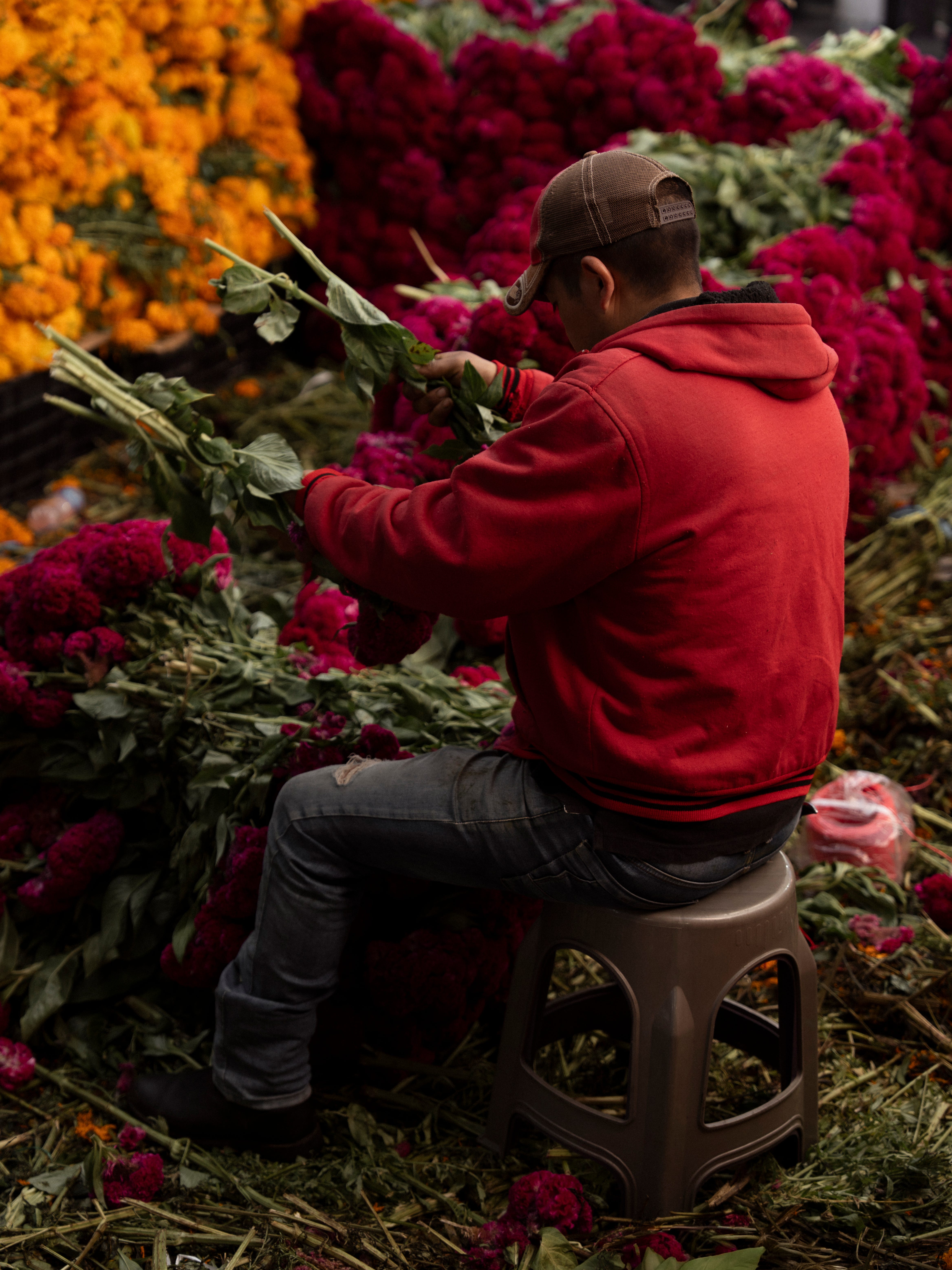 Y es octubre el mes que más activa estas cavilaciones: algo en mí despierta y se revuelve en melancolía. Encuentro, caminando por Madrid, el naranja en los árboles que pronto mudarán de hojas y el olor fresco de una noche otoñal, presagiando otro invierno, pero no basta: necesito esa exuberancia e intensidad de sensaciones de un octubre mexicano. En mi ciudad, esta exuberancia es posible gracias a la labor de agricultores, transportistas y vendedores, que mueven un flujo extraordinario de flores de cempasúchil cada año en los días antes del 2 de noviembre. El mercado de Jamaica es el centro neurálgico de esta movilización, y el corazón del día de muertos en la CDMX. La forma como Diego Orvañanos captura este frenesí, y el trabajo de los que hacen esto posible, es increíble. Sin más dejaremos que lo cuente Diego.