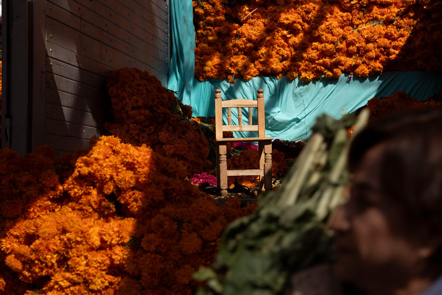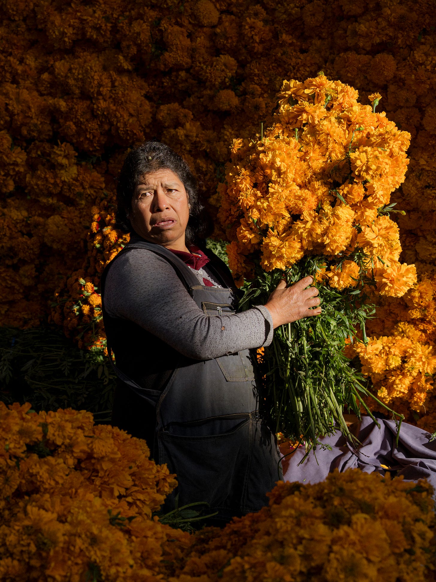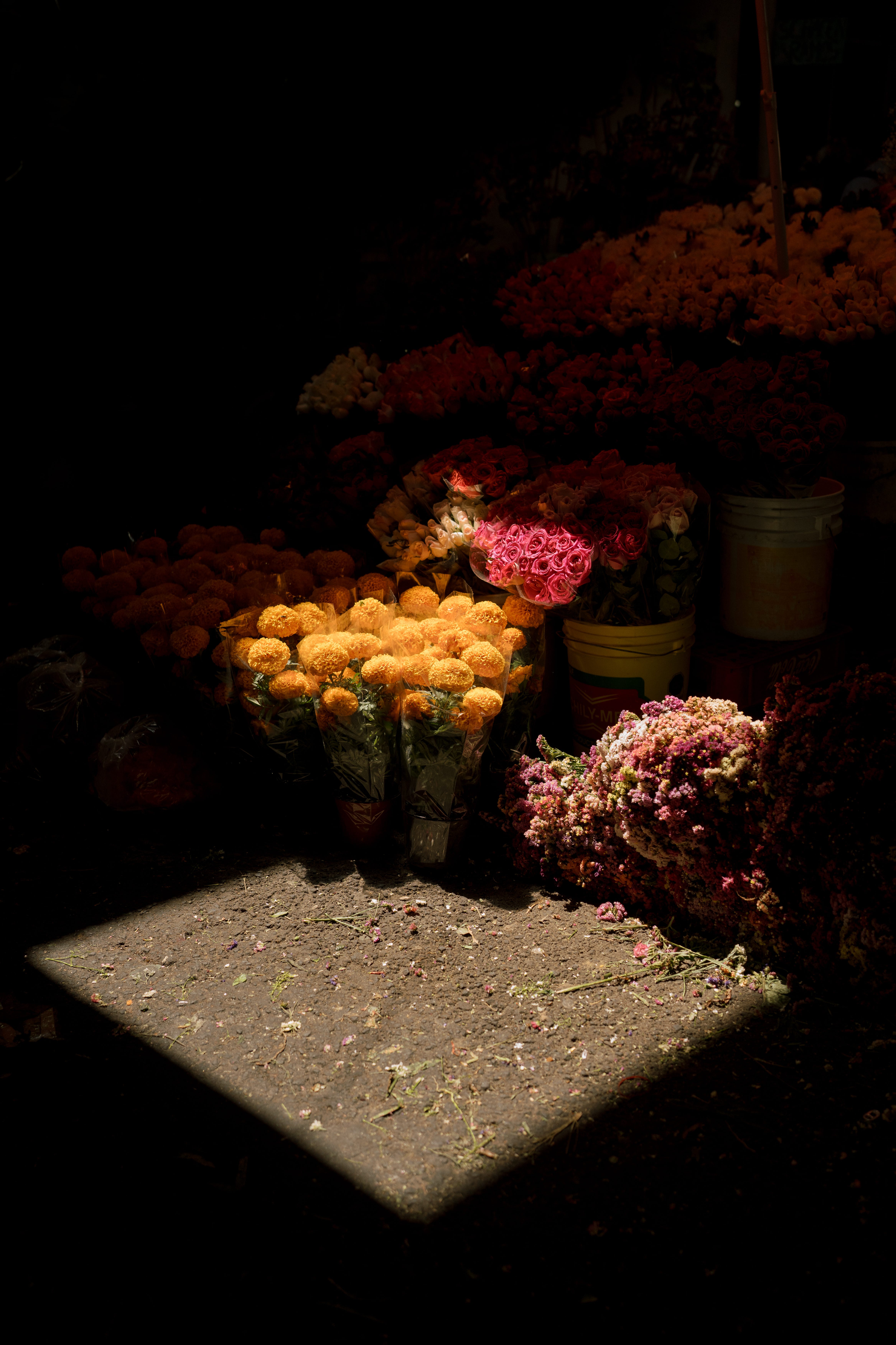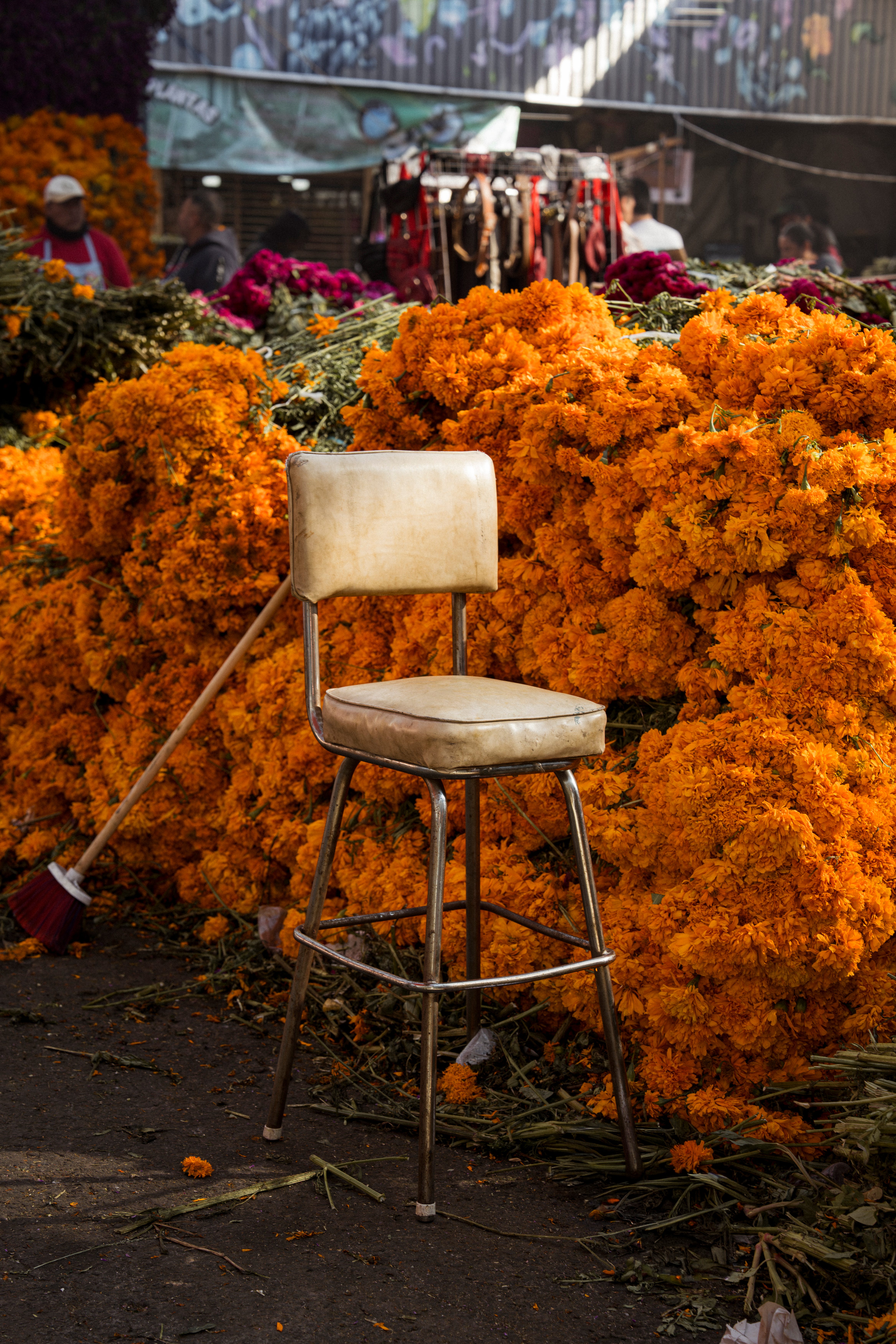 Y es octubre el mes que más activa estas cavilaciones: algo en mí despierta y se revuelve en melancolía. Encuentro, caminando por Madrid, el naranja en los árboles que pronto mudarán de hojas y el olor fresco de una noche otoñal, presagiando otro invierno, pero no basta: necesito esa exuberancia e intensidad de sensaciones de un octubre mexicano. En mi ciudad, esta exuberancia es posible gracias a la labor de agricultores, transportistas y vendedores, que mueven un flujo extraordinario de flores de cempasúchil cada año en los días antes del 2 de noviembre. El mercado de Jamaica es el centro neurálgico de esta movilización, y el corazón del día de muertos en la CDMX. La forma como Diego Orvañanos captura este frenesí, y el trabajo de los que hacen esto posible, es increíble. Sin más dejaremos que lo cuente Diego.