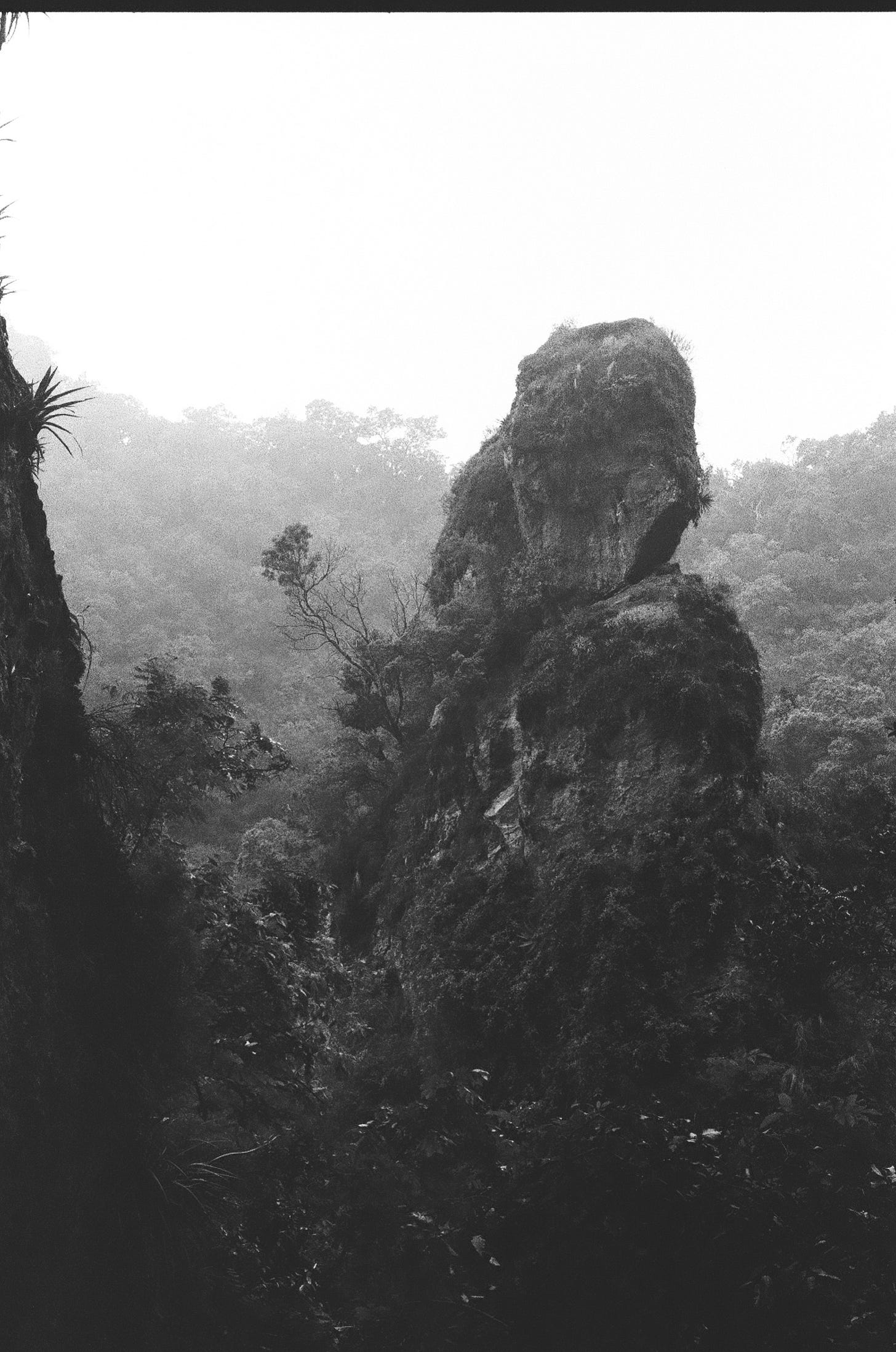 Recibí hace unos meses, finalmente, los negativos del viaje que realicé hace ya más de un año a Tepoztlán. Me regocijé al confirmar que tomé la decisión correcta optando por treinta y cinco milímetros en carrete Ilford; que los contrastes entre los insondables negros y brumosos blancos habían logrado conservar, por un artificio químico, lo perenne de ese instante de verano de 2024. Pero no pretendo que sea este otro laudatorio de la fotografía analógica. Estas fotos, descubrí al verlas, son ante todo un retrato singular del secreto que creí vislumbrar y hoy recuerdo, al adentrarme en el Tepozteco.