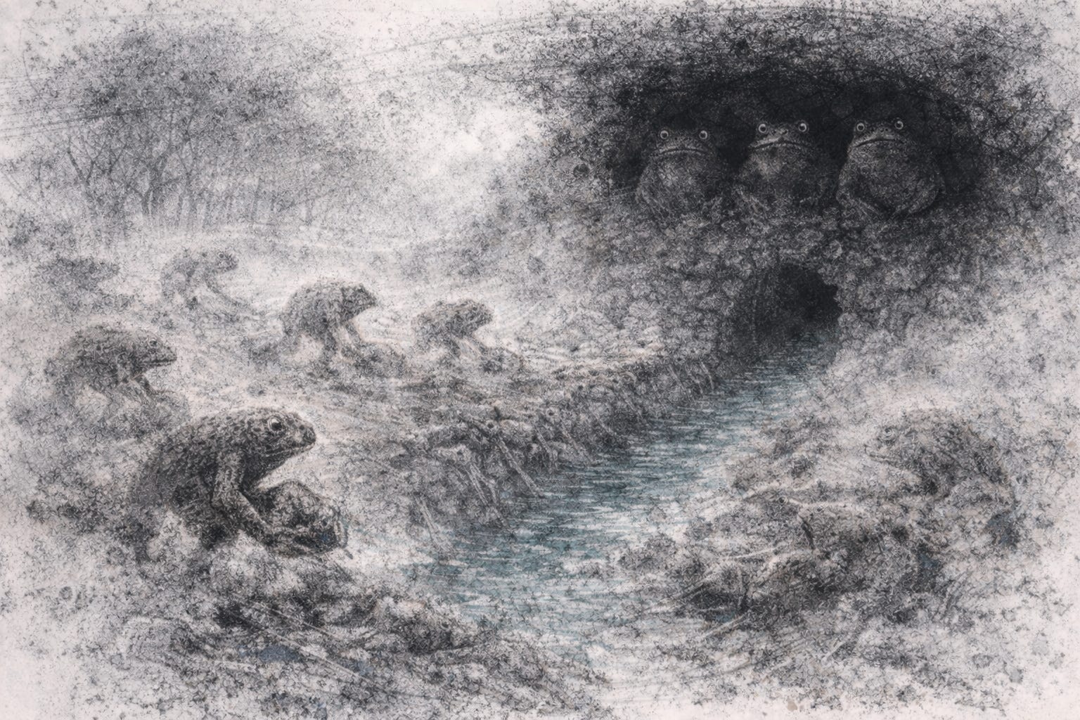 Fue una mañana cualquiera. Ni especialmente calurosa ni especialmente fría. Nadie esperaba que pasara nada distinto a lo de siempre. Las ranas fuertes cargaban piedras. Las débiles arrastraban ramas. Y su abuelo, como siempre, iba detrás, con su paso torpe, encorvado, hundiendo el cuerpo en el barro hasta casi desaparecer.